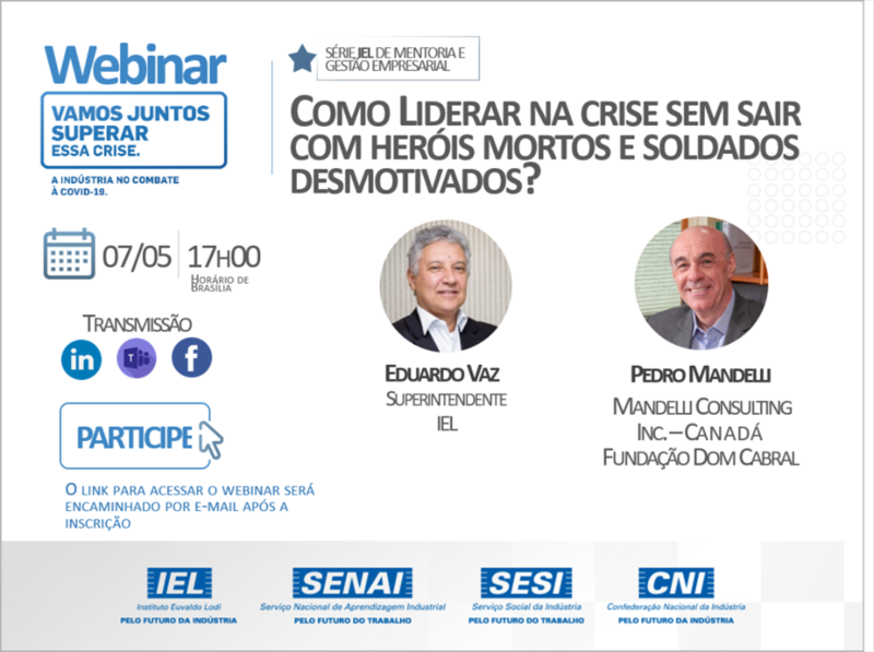 Visando driblar os efeitos provocados pela pandemia, o Instituto Euvaldo Lodi (IEL) promove uma série de webinars com a participação de especialistas em Gestão Empresarial. A estruturação dos temas, conduzidos por meio do conhecimento e experiência dos convidados, contribui para a tomada de decisão das demandas que se apresentam a partir da nova realidade. Os bate-papos abertos a gestores de empresas e público interessado acontecem sempre às quintas-feiras, às 17 horas, ao vivo, pelas redes sociais do IEL e da CNI.
