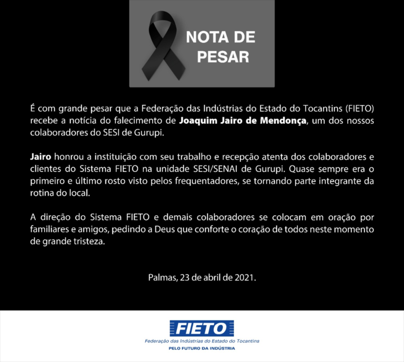 É com grande pesar que a Federação das Indústrias do Estado do Tocantins (FIETO) recebe a notícia do falecimento de Joaquim Jairo de Mendonça, um dos nossos colaboradores do SESI de Gurupi.